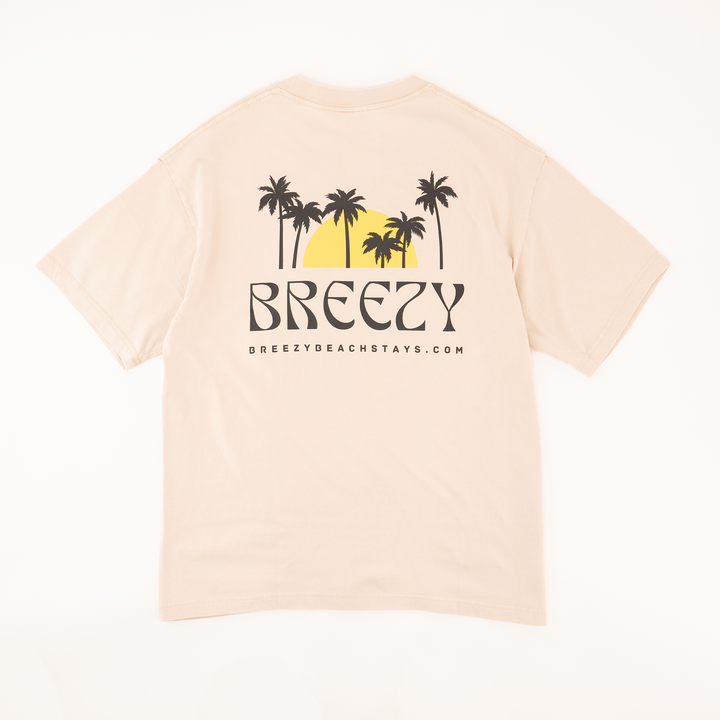 Bring the beach vibes wherever you go with the Breezy Sunset Palms Tee! This ultra-soft, mineral-washed t-shirt features a bold back graphic of palm trees silhouetted against a golden sunset, along with the Breezy Beach Stays logo. Perfect for laid-back days, coastal adventures, or just dreaming of your next getaway.